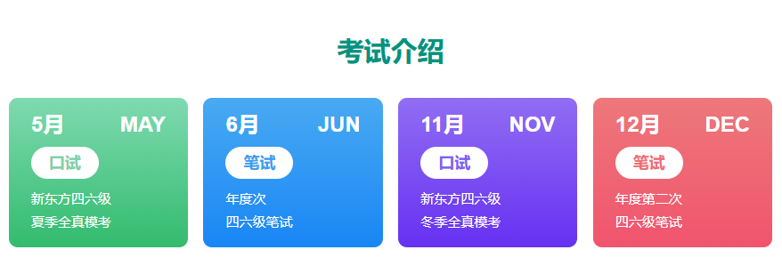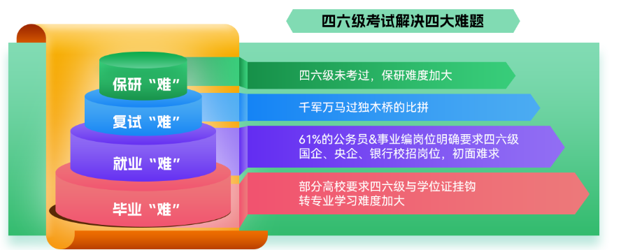 新东方英语四六级一般代指英语四六级,四六级考试是教育部主管的一项性的英语考试,其目的是对大学生的实际英语能力进行客观、准确的考量,为大学英语教学提供测评服务。大学英语考试是一项大规模标准化考试,是一个“标准关联的常模参照测验”。大学英语四、六级考试作为一项性的教学考试由“教育部高教司”主办,分为四级考试(CET-4)和六级考试(CET-6),每年各举行两次,分别在同的上午和下午进行。